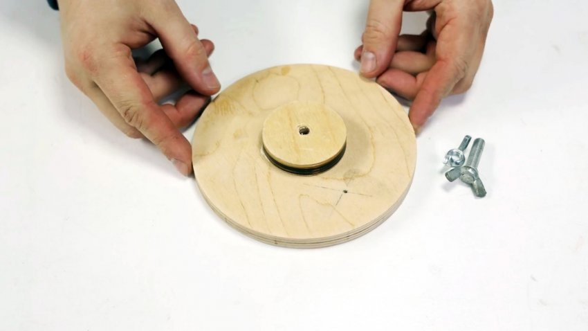 Приклеиваем концентрично малый круг из фанеры с уплотнительным кольцом к большому. На время круги сжимаем шпилькой и двумя гайками-барашками через отверстия в центре кругов.