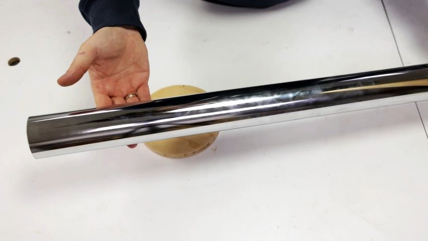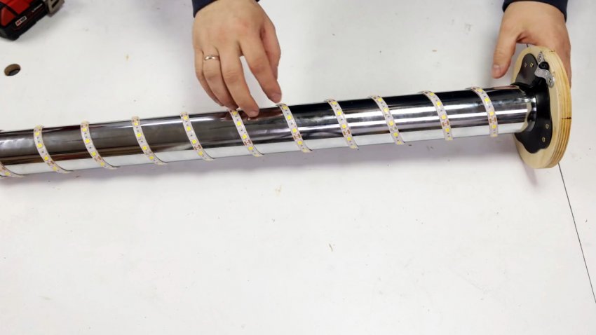 Ленту по спирали равномерно наматываем вокруг никелированной трубы до конца и помещаем в трубу из шпона и прозрачного пластика, включая и фанерный круг. Напротив контакта светодиодной ленты делаем в трубе отверстие.