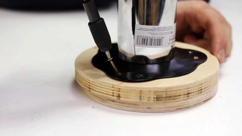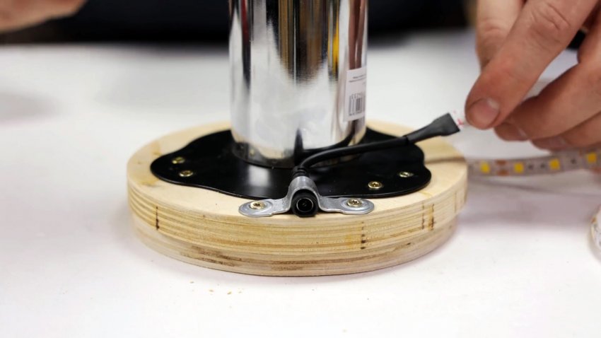 На второй круг из фанеры устанавливаем фланец-основание с никелированной трубой и крепим шурупами. Закрепляем к кругу радиально контакт светодиодной ленты с помощью скобы с лапками и шурупов.
