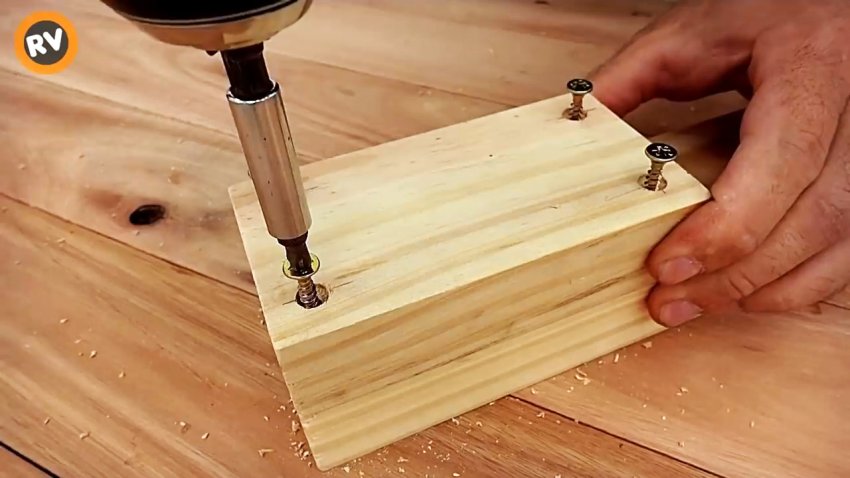 Длину деревянных брусков выбираем, исходя из места их применения. Размечаем на коротком бруске центры отверстий по углам. Укладываем его на конец длинного бруска, выравниваем, зажимаем струбциной и сверлим отверстия с зенковкой. Садим бруски на клей и скрепляем шурупами.