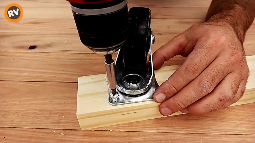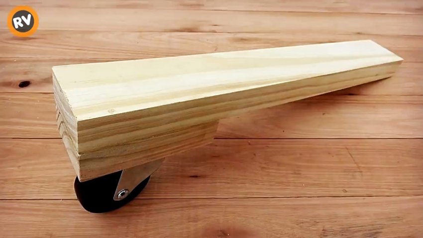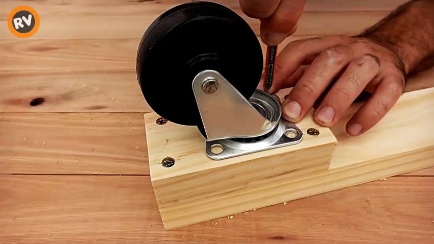 К короткому бруску крепим резиновое колесо для мебели так, чтобы оно при повороте не выходило за торцы брусков, и также закрепляем шурупами.