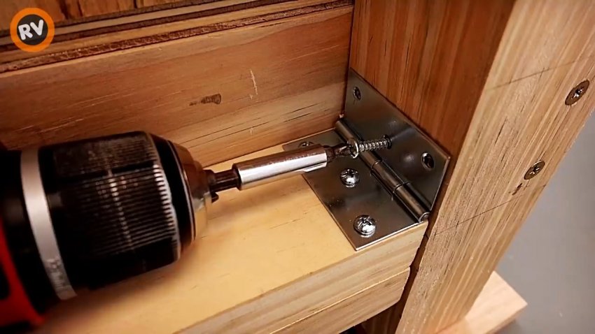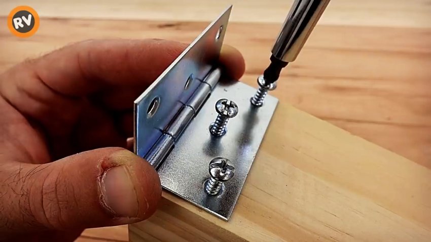 К торцу длинного бруска крепим шурупами универсальную петлю так, чтобы свободная пластина в вертикальном положении не выходила за край бруска.