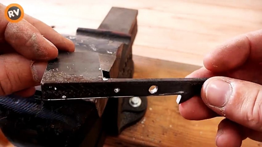 Из уголка 40×3 мм вырезаем защелку по разметке с заданными размерами, удаляем заусенцы, подравниваем углы и скругляем кромки напильником. Намечаем и сверлим два отверстия разного диаметра.