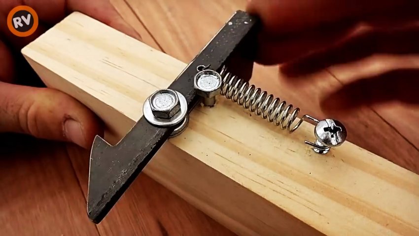 Упираем защелку в болт так, чтобы между фрагментом полки уголка и бруском был зазор не менее 5 мм. Справа от болта вкручиваем шуруп, но не до конца. В малое отверстие на защелке заводим конец пружины сжатия.