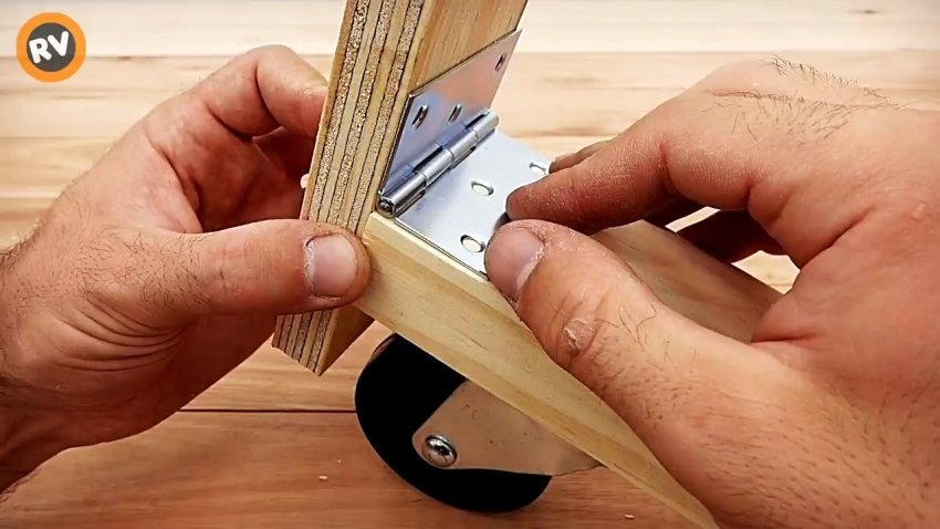 Второе мебельное колесо и петлю монтируем на брусок покороче без короткого бруска и защелки. Скругляем верхнюю грань свободного торца бруска наждачной бумагой.