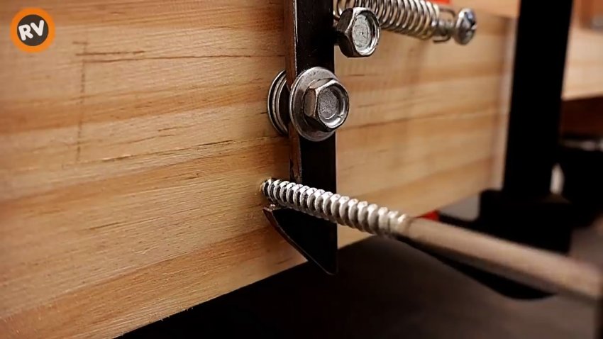 Болт с гладкой частью под головкой и шайбой пропускаем через отверстие в защелке, с обратной стороны на болт надеваем 3 шайбы и крепим защелку к бруску, чтобы она могла поворачиваться. Другой конец пружины надеваем на болт.