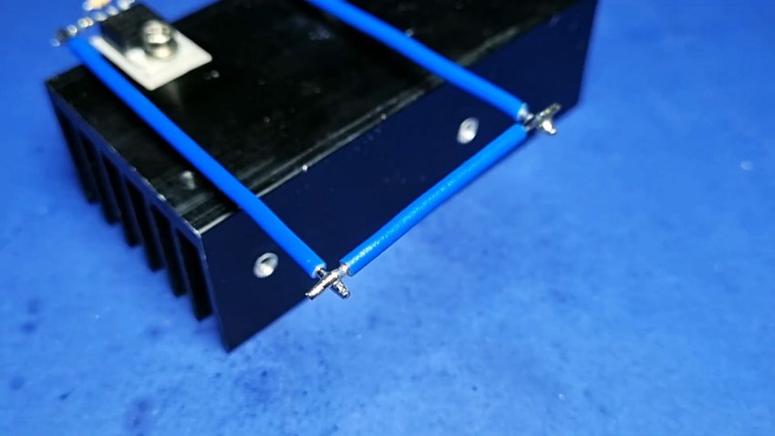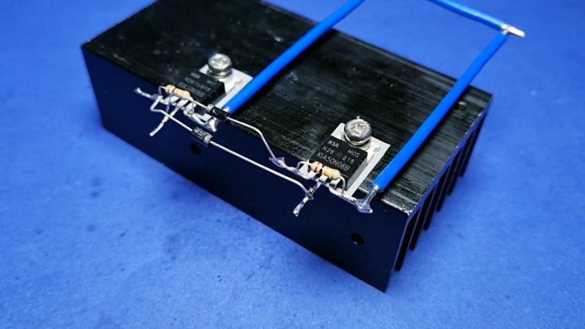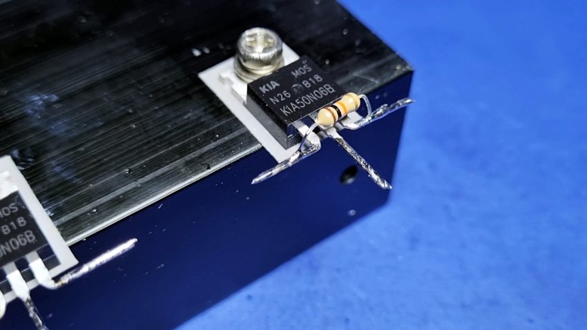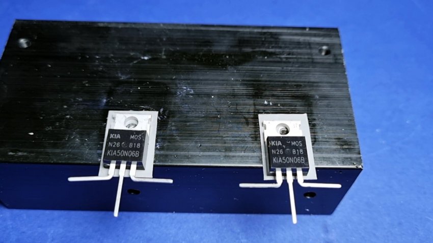 К алюминиевому радиатору, используемому как станина устройства, необходимо прикрутить два транзистора 50N06.