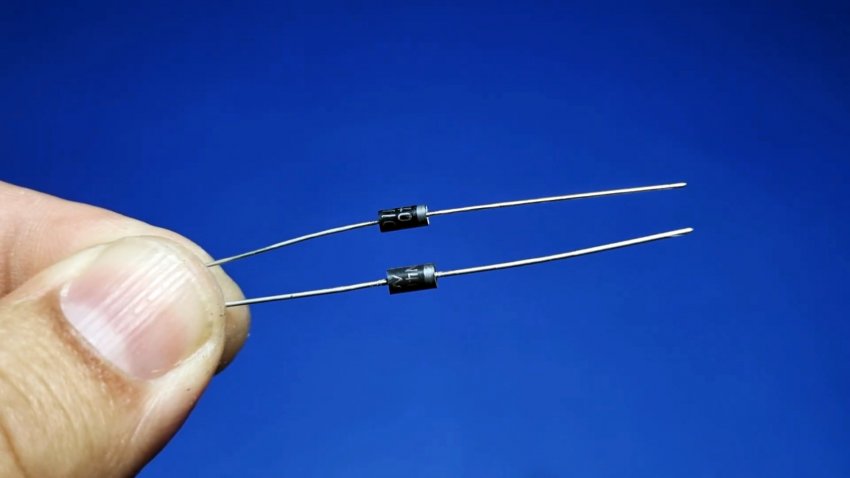 Затем берем выпрямительный диод 1N4007, и паяем к центральной ножке первого транзистора и первой ножке второго, как показано на фото.