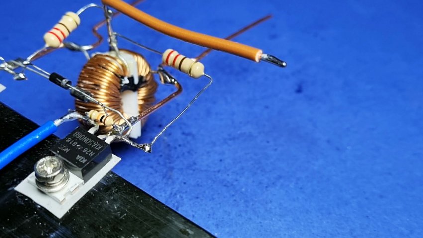 Второй резистор нужно тоже припаять к этой жиле, но его оставшийся конец подключить к первой ножке первого транзистора. Затем паем к проволоке конденсаторы с индукционной плиты.