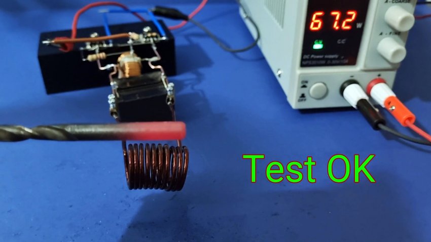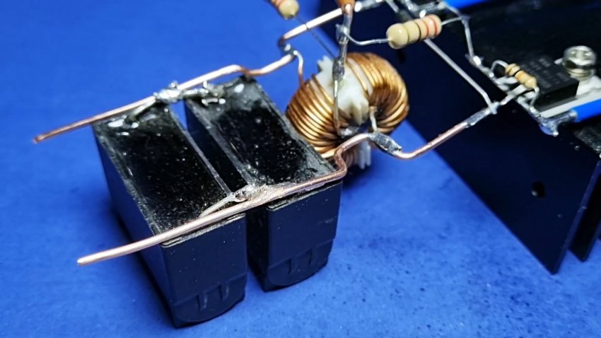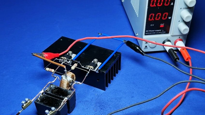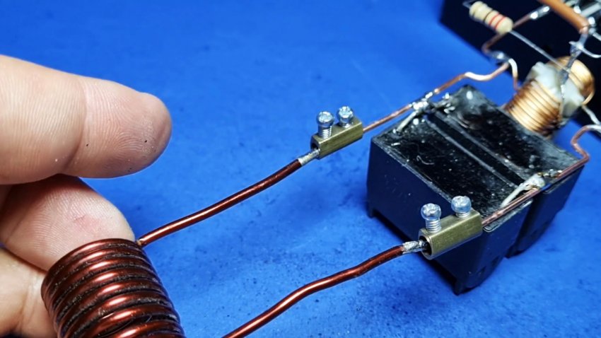 Теперь с помощью клемм, к проволоке за конденсаторами можно подключать катушку с эмалированной проволоки, в которой и будет нагреваться помещений металлический предмет. Питание установки осуществляется блоком на 12В. Его плюс подключаем к проводу на катушке индуктивности, а минус на перемычку, соединяющую транзисторы.