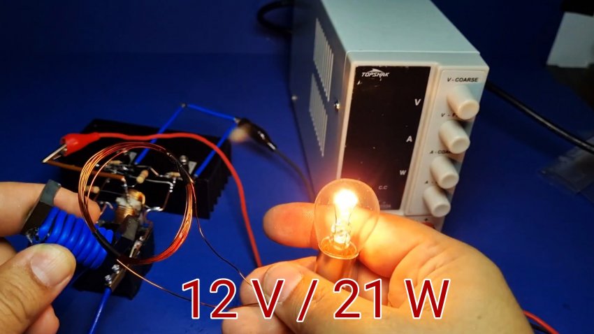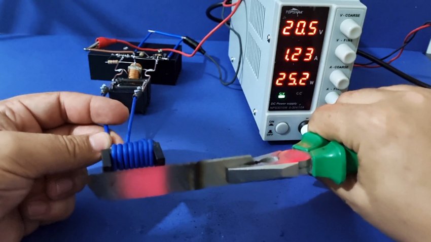 Такая катушка позволяет разжигать лампочку, греть тонкие лезвия, а также кипятить воду в металлической посуде. Область использования этой установки весьма обширна, особенно она нужна для закалки металла.
