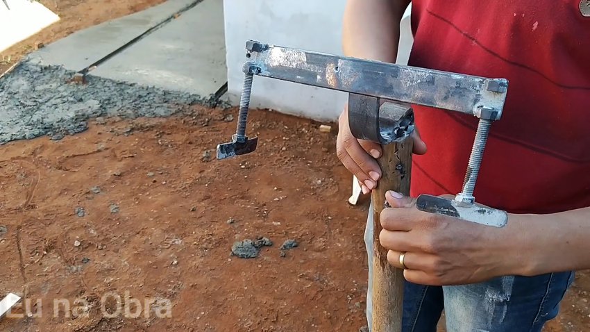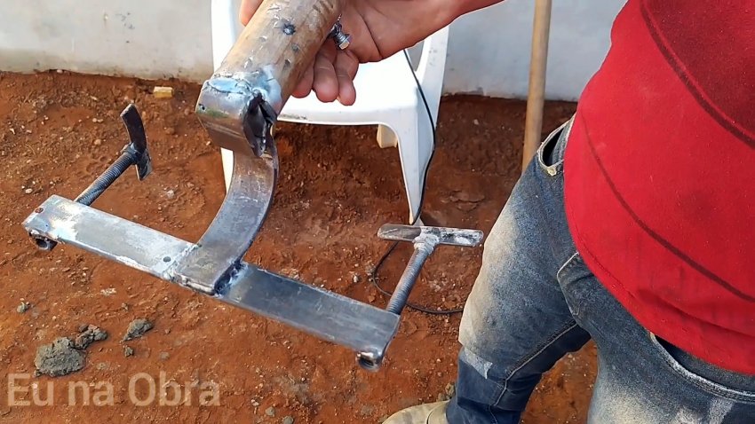 Снизу по краям к жесткой стальной полосе привариваем по две гайки, во внутренние из которых вворачиваем болты. К головкам болтов поперечно привариваем пластины для удобства вращения. Вставляем в трубу деревянный черенок и затягиваем болт благодаря гайке, приваренной к трубе, чтобы надежно зафиксировать черенок в рабочем положении.