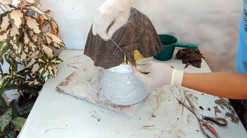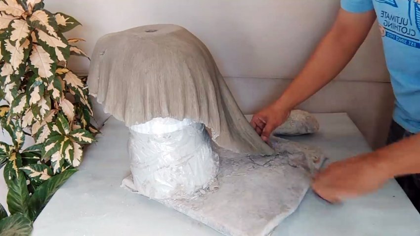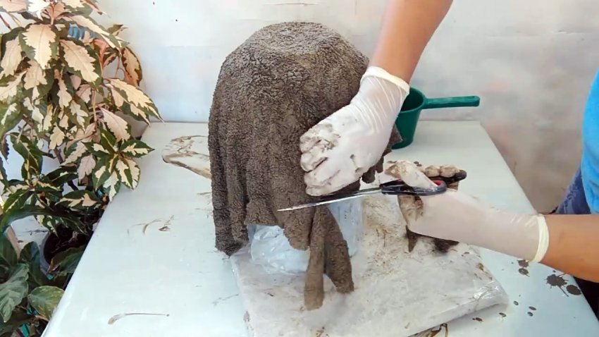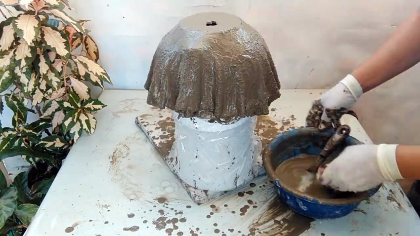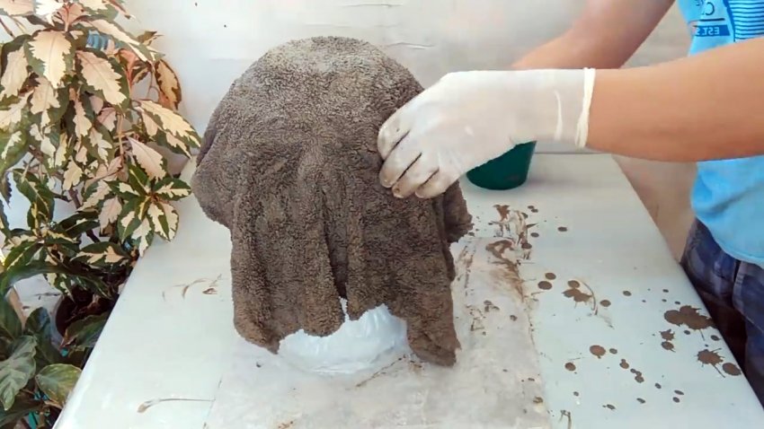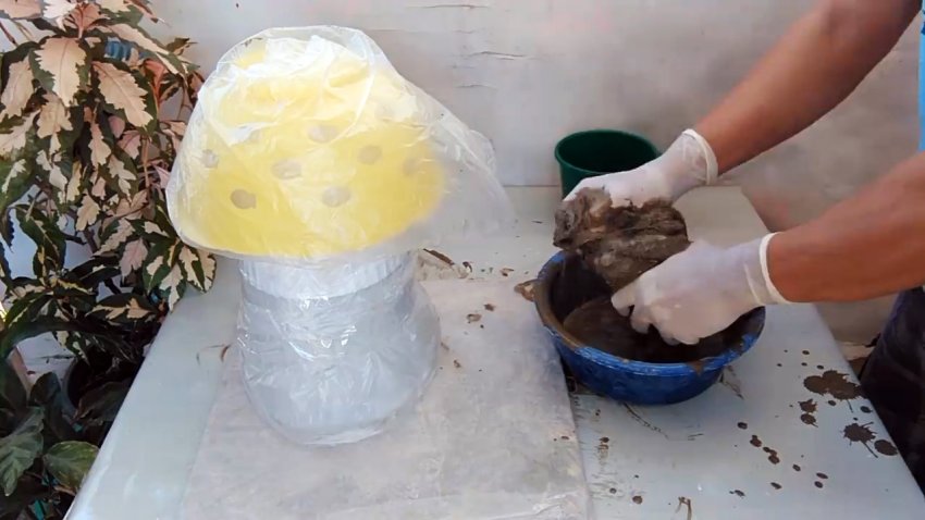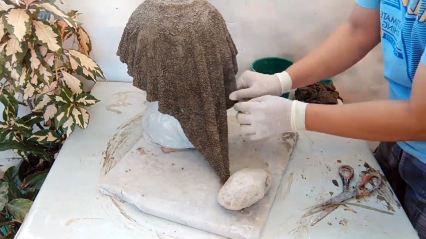 В отдельной емкости смешиваем цемент с водой. Нужно получить раствор с консистенцией сметаны. В нем вымачиваем лоскут ткани, затем накрываем им установленную на подставку форму, перевернутую вверх дном.