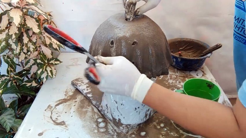 Увлажняем кистью кашпо изнутри. Затем обмазываем его и шею цементным раствором, но уже более густым, чем применялся для пропитки ткани. Это позволит создать гладкую поверхность без впадин.