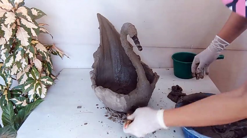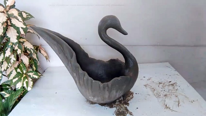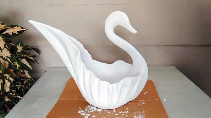 Если все делать правильно, то должна получиться форма лебедя с плавными линиями. Причем следы от кисти оставляют волны похожие на перья. После этого ждем застывания раствора. Затем убираем огрехи наждачной шкуркой.