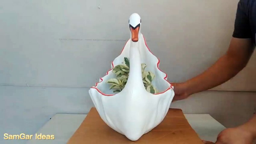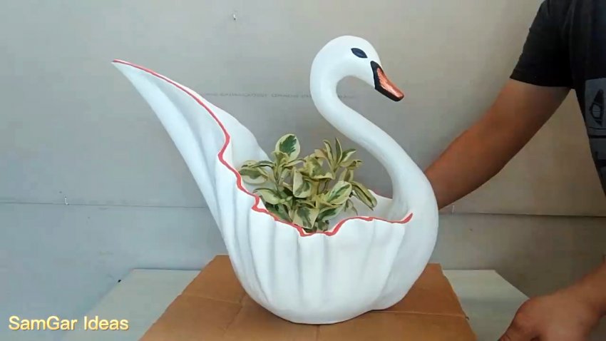 Последним штрихом будет окраска лебедя белой атмосферостойкой краской. Также добавляем в небольшое ее количество колер, и рисуем глаза, клюв, а также окантовку. Можно даже покрыть кашпо прозрачным полиуретановым лаком, чтобы краска сохранялась дольше.