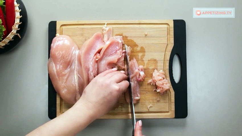Мясо порежьте полосками, затем кубиками. Переложите в чашу, посолите и поперчите.