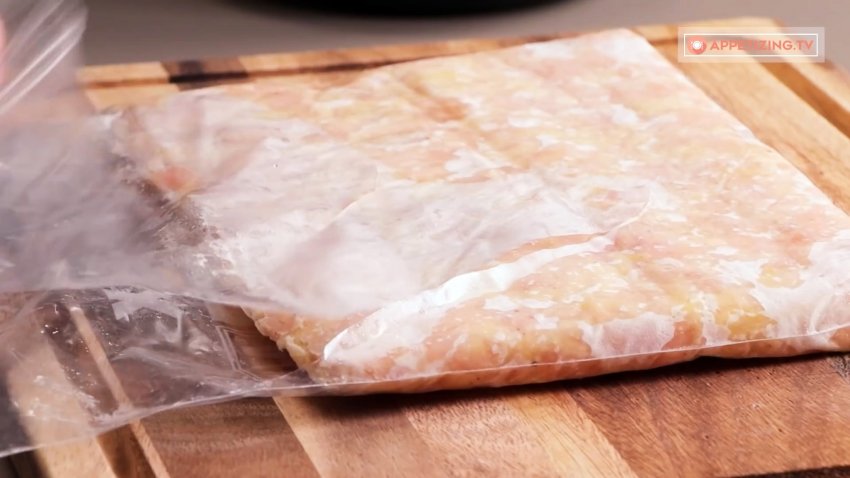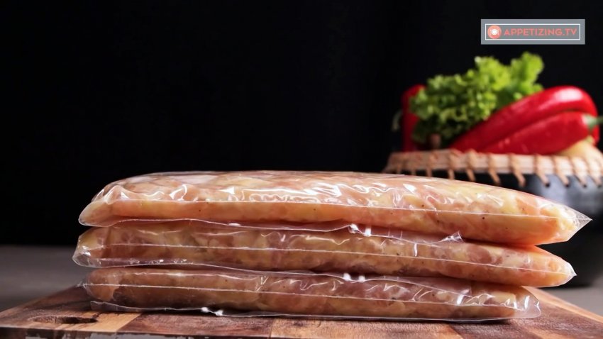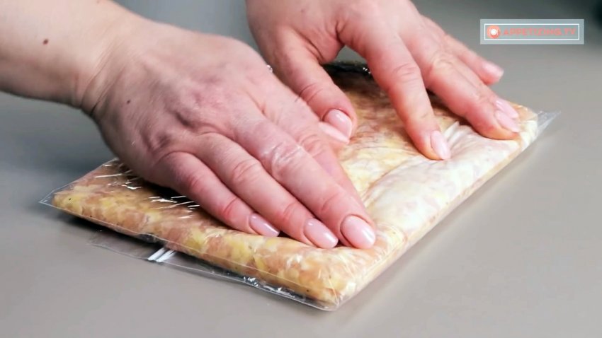Фарш хорошо вымешайте руками, чтобы масса стала однородной. Разделите ее на несколько частей и поместите в полиэтиленовые пакеты. Сформируйте прямоугольную форму и уберите в морозильную камеру на 3 часа.