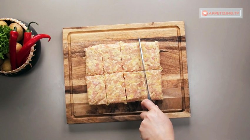 Когда полуфабрикат затвердеет, достаньте его и разрежьте на квадратные котлеты.
