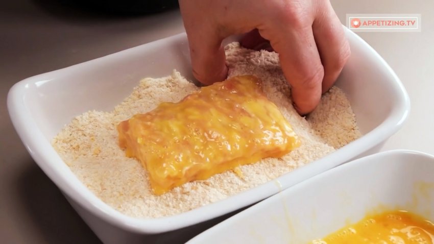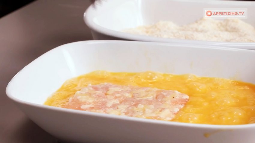 Каждую заготовку обмокните в яйце, взбитом вилкой. Затем в панировочных сухарях.