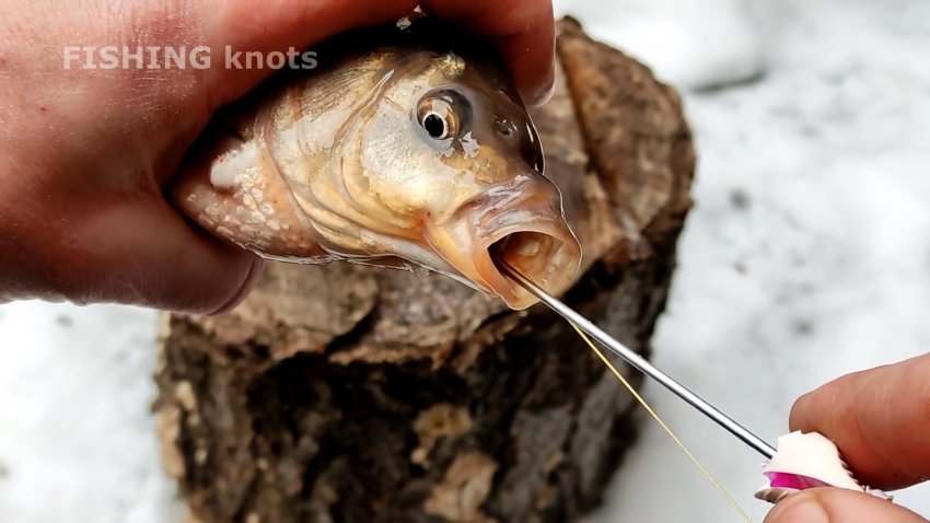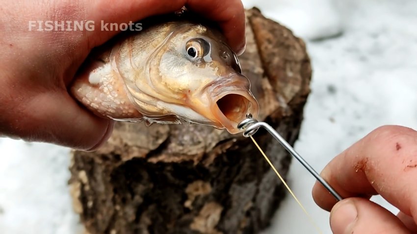 Теперь достаточно, придерживая рыбу одной рукой, другой подать экстрактор вперед по направлению лески. В результате крючок окажется на витках экстрактора и удаляется из пасти рыбы вместе с нашим приспособлением.