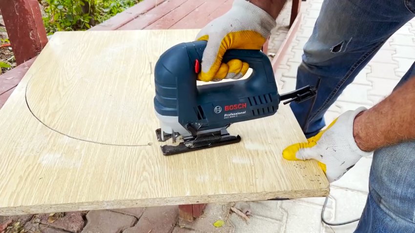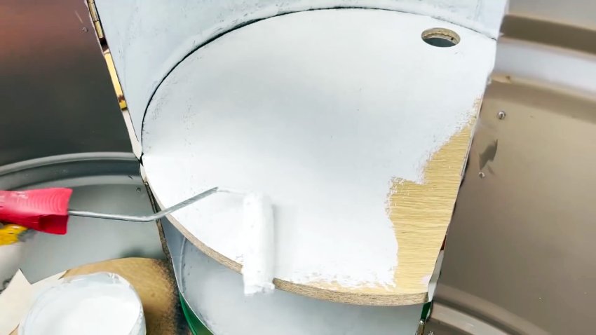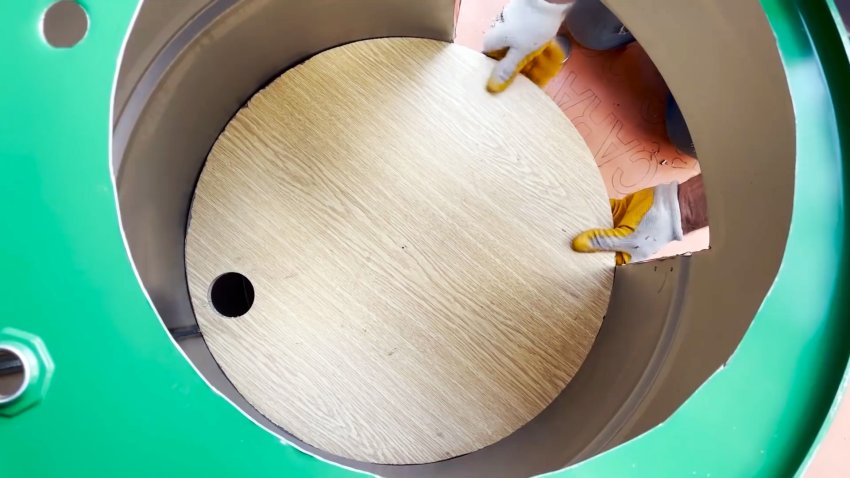 В мебельном щите вырезаем круг, равный внутреннему диаметру ребра жесткости бочки. В нем также сверлим отверстие и устанавливаем в паз ребра жесткости так, чтобы отверстие лежало в той же плоскости, что и два перфорации в бочке.