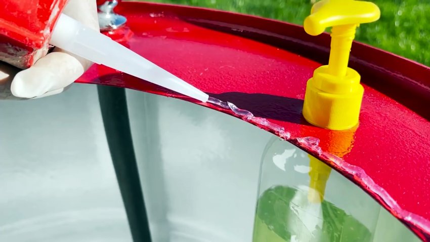 В емкость дозатора заливаем жидкое мыло, заводим горловину снизу в отверстие крышки и накручиваем колпачок с дозатором.