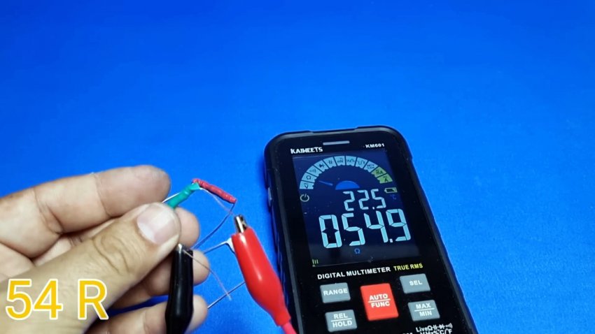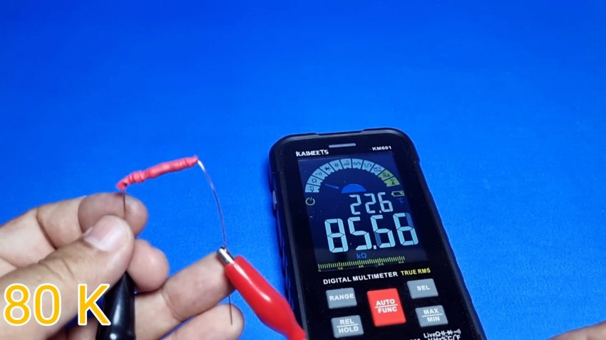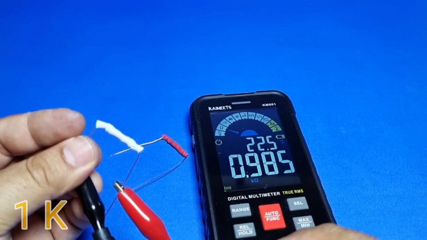 Подключим получившийся резистор к мультиметру. Регулировкой расстояния между электродами добьемся нужного сопротивления. Далее обернем все изолентой.