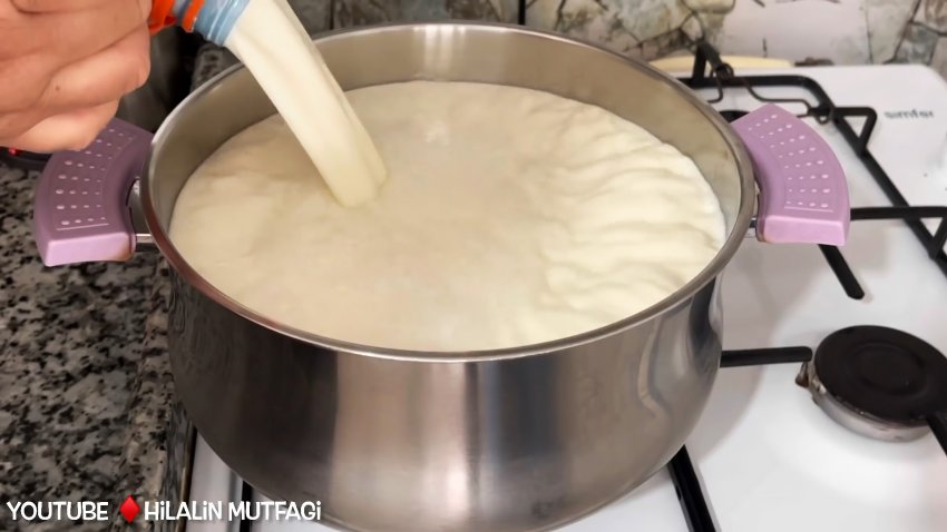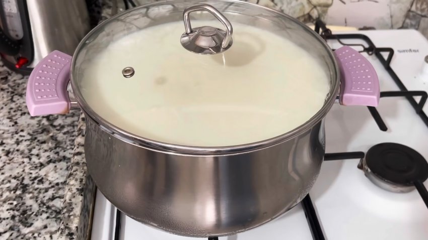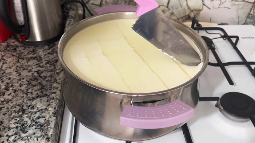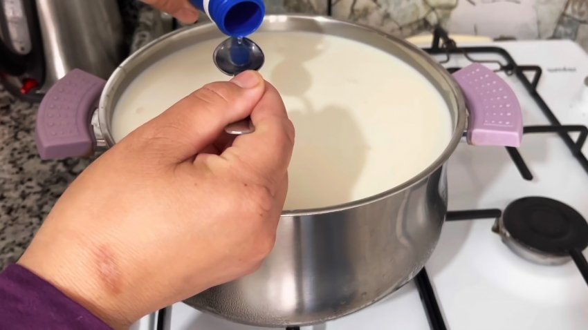 Когда появятся первые пузырьки – выключите конфорку, влейте сычужный фермент и размешайте.