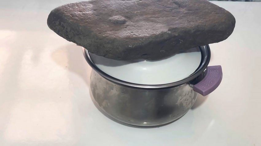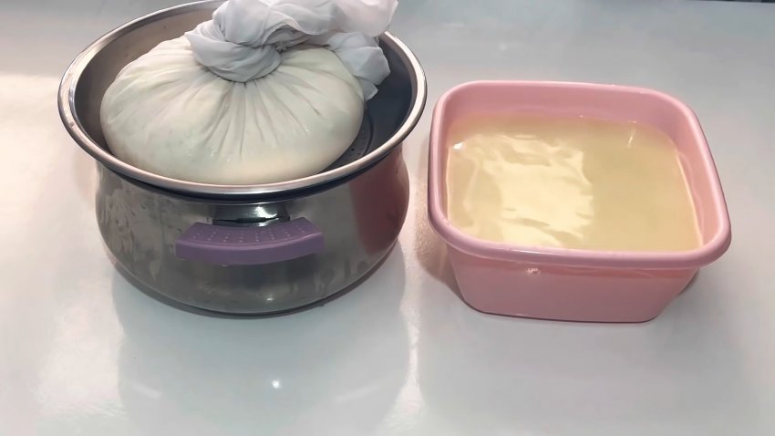 Оставьте под гнетом на 5 часов, чтобы сыворотка полностью стекла.