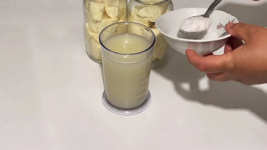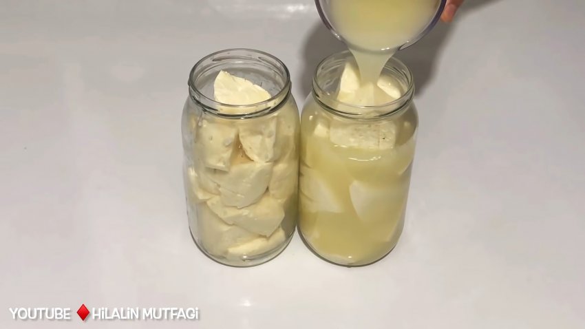 Нарежьте кубиками, поместите в стеклянные банки, залейте сывороткой, смешанной с солью.