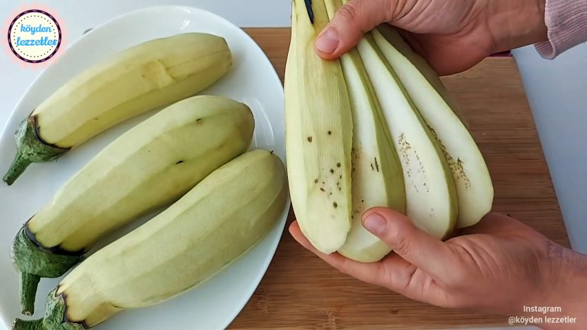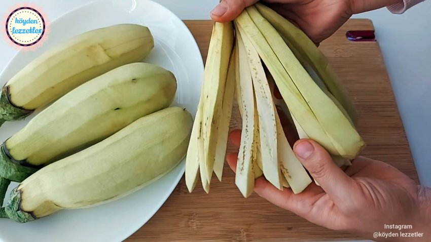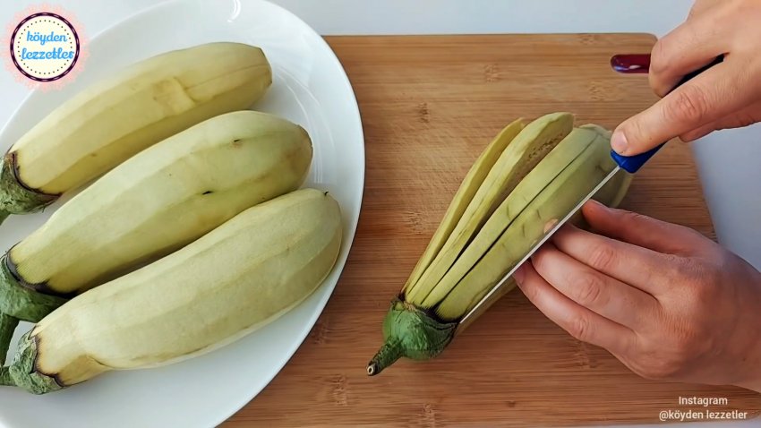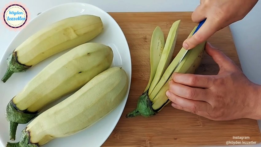 Очистите баклажаны от кожуры с помощью овощечистки. Плодоножку срезать не нужно. Острым ножом сделайте тонкие слайсы, затем полоски.
