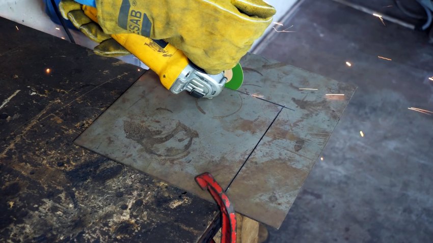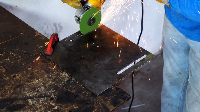Подготавливаем опорную плиту приставки. Хорошо закрепив большой лист стали на верстаке, вырезаем из него «болгаркой», меньший лист, по размерам, выбранным для создания плиты. Обрабатываем плиту шлифовальным кругом.