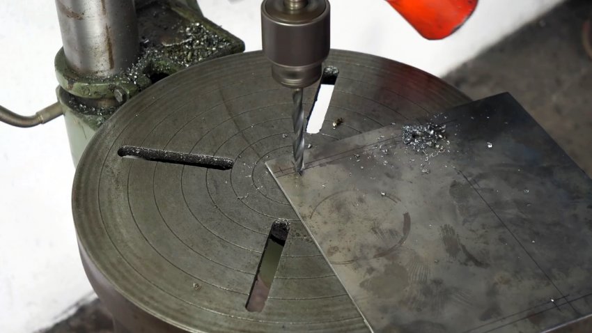 Сверлим намеченные отверстия. Линиями, поперечными длине приставки, соединяем оба отверстия так, чтобы получилась разметка прорезей с закругленными краями. По проведенным линиям прорезаем металл «болгаркой». Зажав плиту в тиски, полученные прорези дорабатываем плоским напильником.