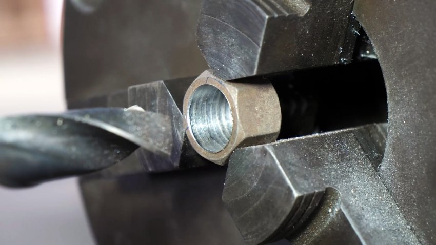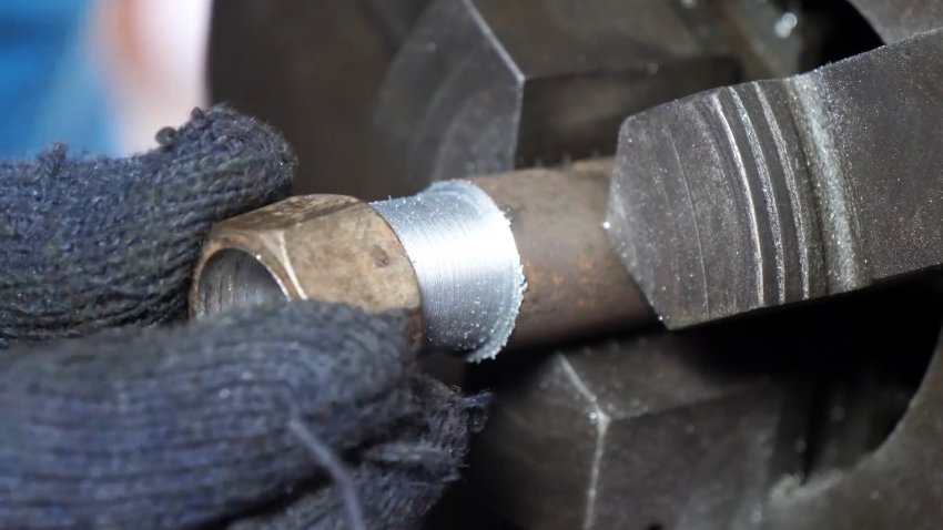 Расточив на станке гайки М12 или подобрав подходящие втулки, делаем опорные стойки шарнира рабочей плиты приставки. По полученному внутреннему диаметру гаек, на этом же станке, вытачиваем вал шарнира, который будет поворачиваться в этих гайках.