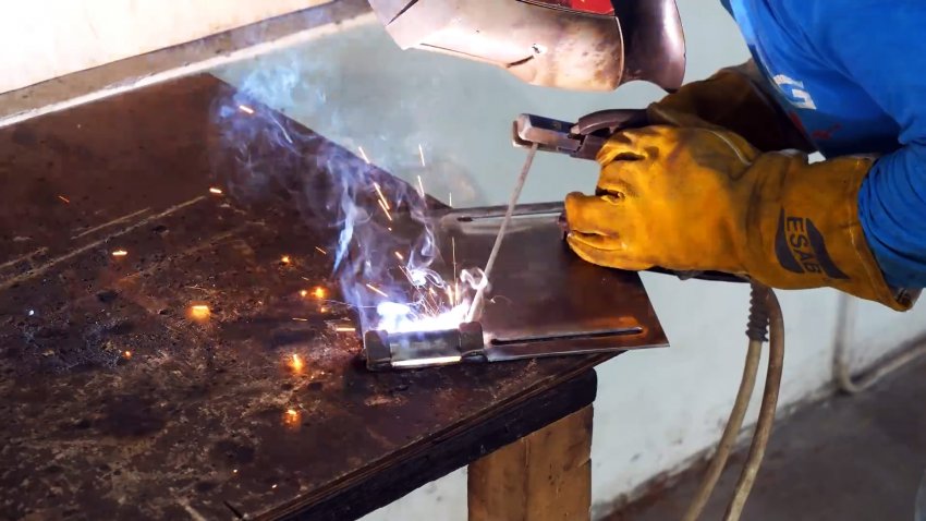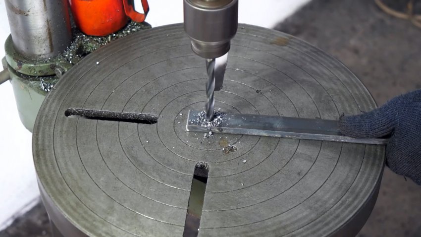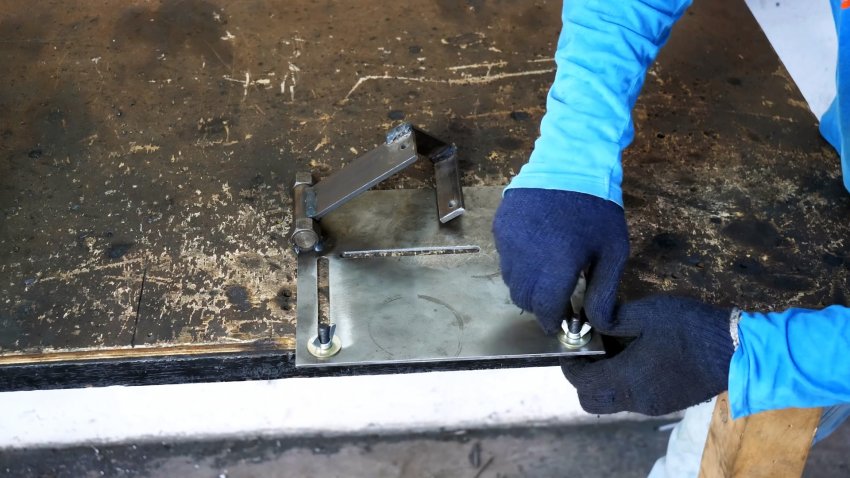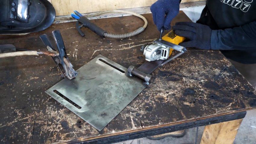 Отрезаем от узкого листа стали, еще один отрезок, длина которого должна позволить изготовить боковую консоль для крепления УШМ к противоположному отверстию на её корпусе. Для этого, полученный отрезок делим на две части. Отступив от края одного из них, размечаем и сверлим отверстие, аналогичное тому, которое было сделано на рабочей плите. Отрезок с отверстием, присоединяем к УШМ так, чтобы он был перпендикулярен «болгарке» и выступал за его пределы на 10-11 см, со стороны, противоположной прорезям на несущей плите. Второй отрезок прикладываем одним концом к рабочей плите, а вторым – к выступающему торцу первого отрезка. «Прихватываем» все стыки несколькими точками сварки и убираем УШМ. После чего хорошо провариваем все соединения.