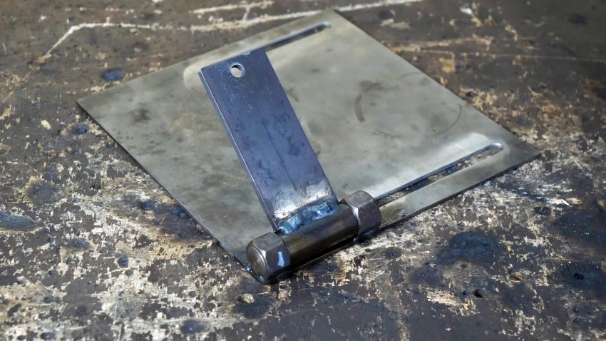Отрезаем от узкого листа стали, отрезок, длина которого равна расстоянию от вала шарнира до центра плиты. Отступив от одного края, с узкой стороны, 3 см., по центральной оси вдоль отрезка, намечаем и сверлим отверстие. Диаметр отверстия должен соответствовать размеру болта, которым к УШМ крепится боковая рукоятка. Краем, противоположным отверстию, привариваем рабочую плиту к валу шарнира.