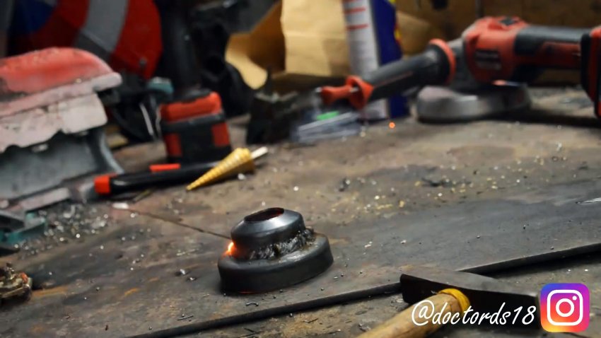 Меньшую заглушку кладем на отверстие большей и закрепляем сваркой. Зачищаем сварочный шов.