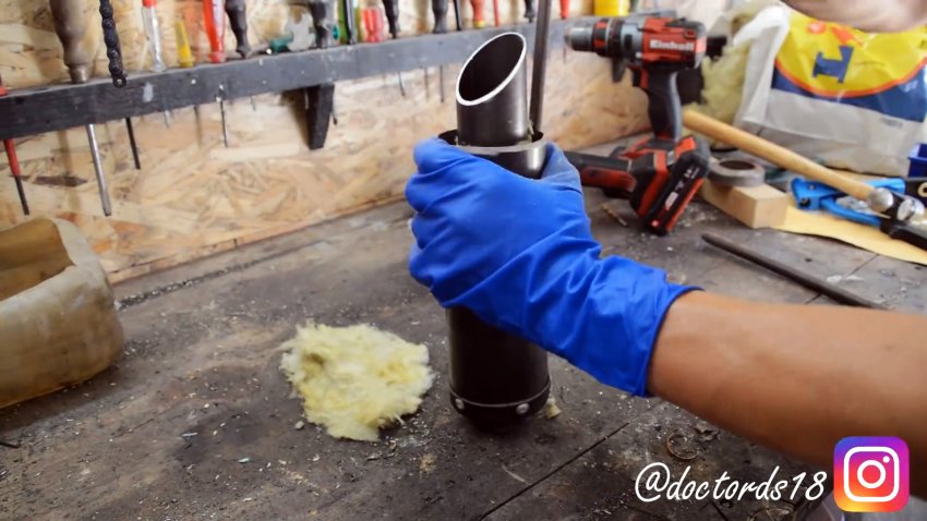 В кольцевой зазор между трубами плотно набиваем минеральную вату с утрамбовкой и плотно закрываем зазор вторым элементом конической заглушки с использованием молотка. Также по окружности высверливаем отверстия и скрепляем детали заклепками.
