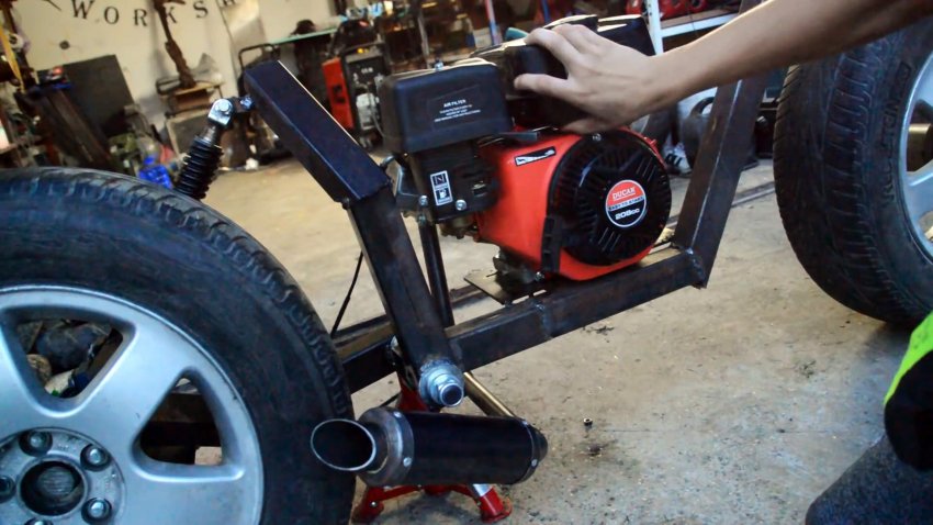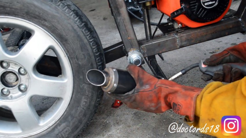 Укорачиваем выхлопной патрубок и с помощью отрезков труб и поворотников выполняем выхлопную систему, которую завершаем подсоединением нашего самодельного глушителя.