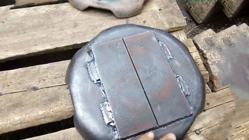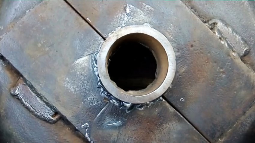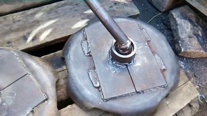 Проведя 3 диаметра, находим центр приваренных пластин и выполняем в них отверстия немного меньше внутреннего диаметра колец, которые привариваем соосно к отверстиям в пластинах.