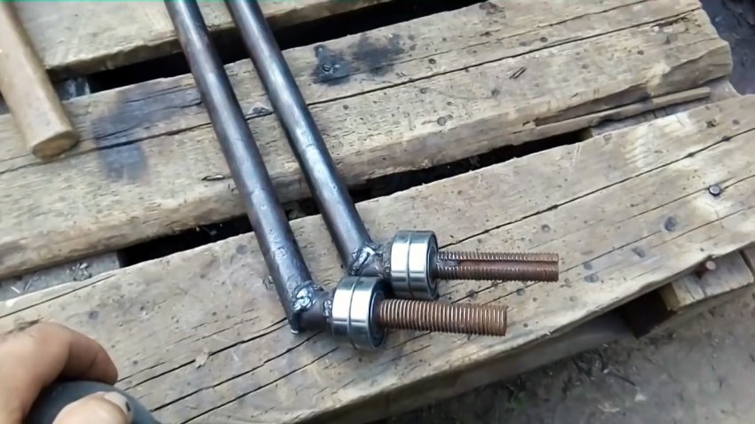 Подержанный вал или ось разрезаем пополам и от концов с резьбой отмеряем такое расстояние, чтобы между линией отреза и подшипниками было не менее 5 см. Отрезанные концы привариваем к остальной части половинок под углом 110 градусов.