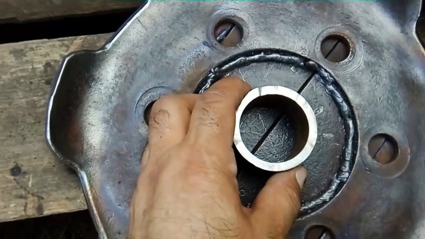 Чтобы подшипники не смещались по осям внутрь, навариваем упоры в виде колец, отрезанных от подходящей по диаметру круглой трубы.