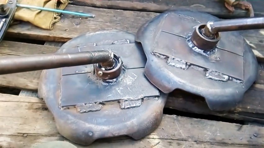 В кольца вставляем оси стоек. Причем наружный подшипник будет упираться в выступы отверстий в пластинах и не даст смещаться стойкам. С наружной стороны оси с подшипниками закрепляем гайками. Диски для окучника вполне готовы к установке.