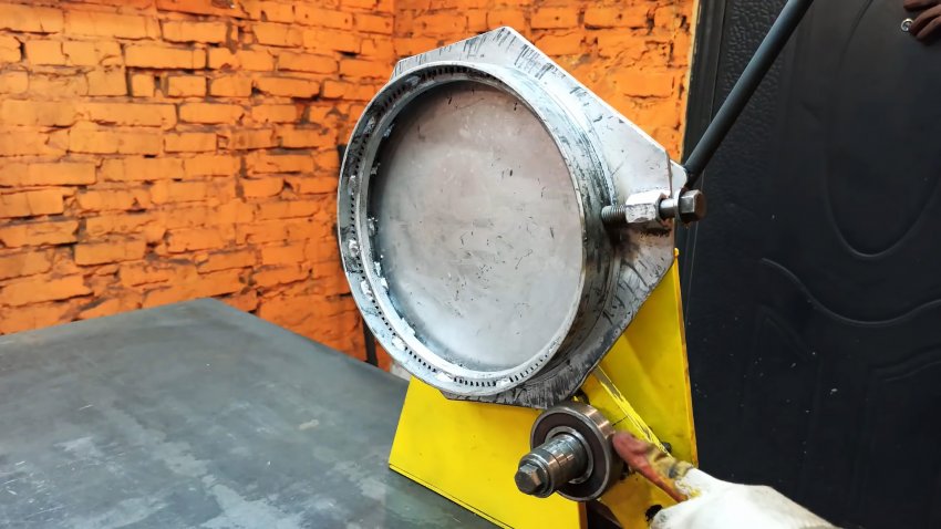 К листу снаружи приварен образцовый круг из листовой стали, усиленный изнутри жестким стальным кольцом. На одной из граней многогранника приварена удлиненная гайка с болтом, направленным радиально по отношению к кругу.