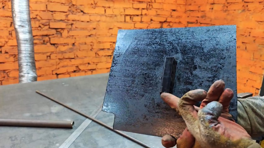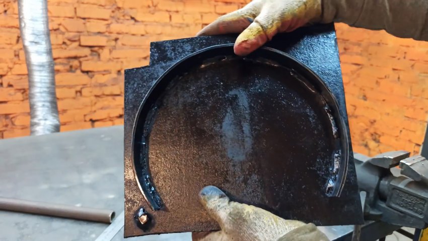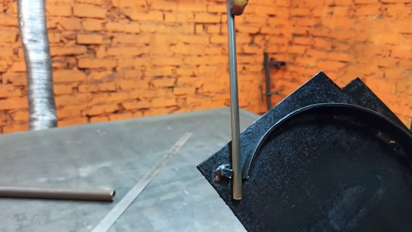 По конструкции второе приспособление для изгиба прутков в кольца заметно проще. Оно состоит из стального листа, с одной стороны которого приварен небольшой отрезок профильной квадратной трубы 20×20 мм для закрепления в тисках, а с другого - 2/3 полного кольца, из стальной полосы. Также у одного из оснований неполного кольца с внешней стороны приварен на расстоянии 12 мм ограничитель-упор из квадратного прутка.