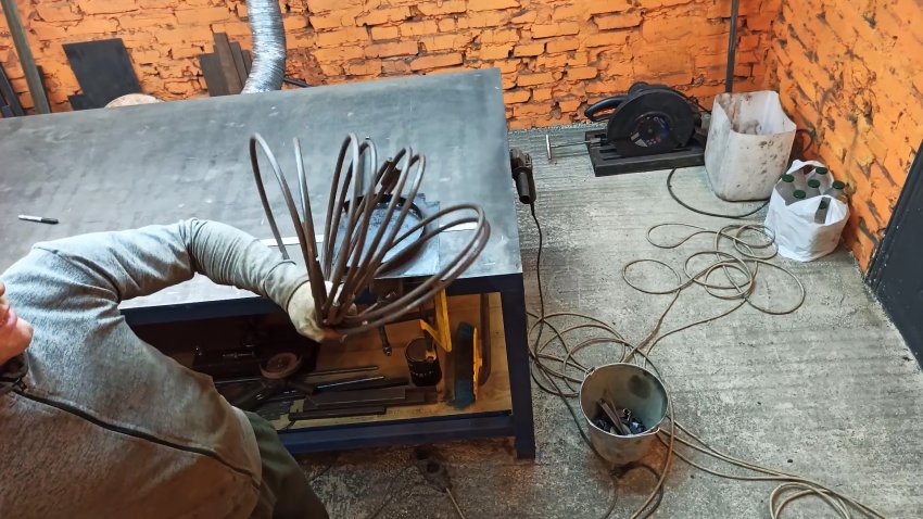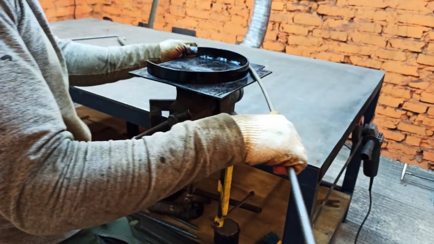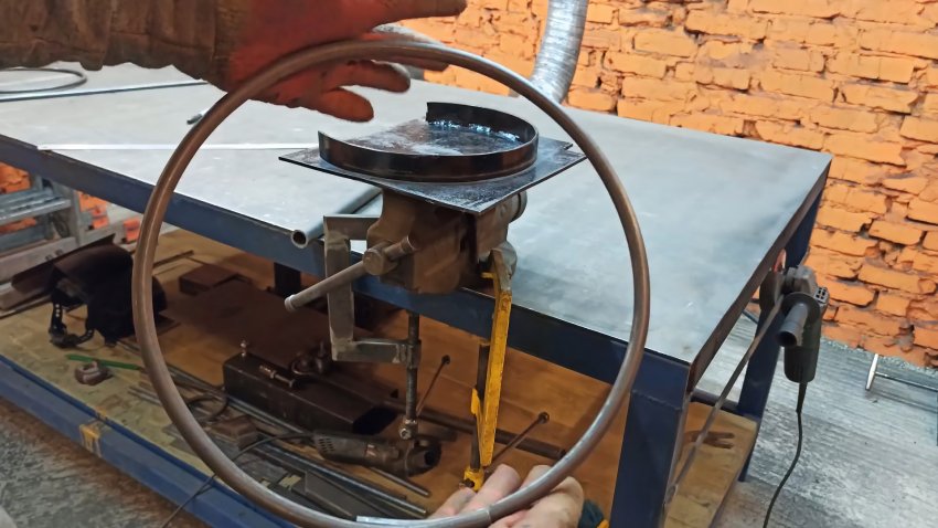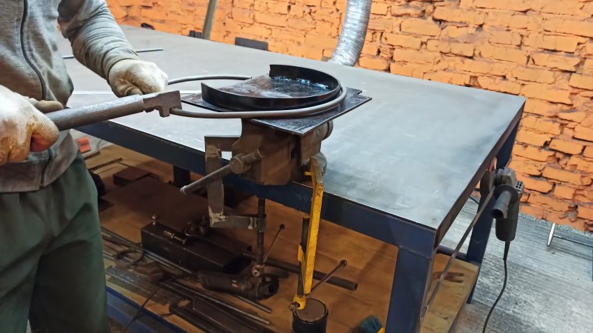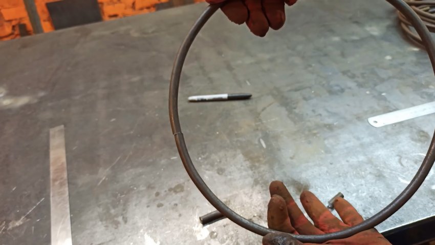 Чтобы не тратить много сил, на последнем этапе изгиба воспользуемся вилкой-рычагом и докручиваем кольцо до конца. Как видно, концы кольца практически без заломов. Концы прутка, согнутого в кольцо, отрезаем посередине нахлеста. Завариваем стык и кольцо полностью готово.