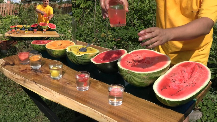 Считается, что арбузы-девочки более сахаристые и вкусные. Они примерно в 2 раза слаще, чем арбузы-мальчики. Отличительным признаком арбуза-девочки является ярко выраженный нарост с углублением со стороны, противоположной плодоножке. Кстати, если сжать спелый арбуз-девочку ладонями, то слышен треск или хруст.