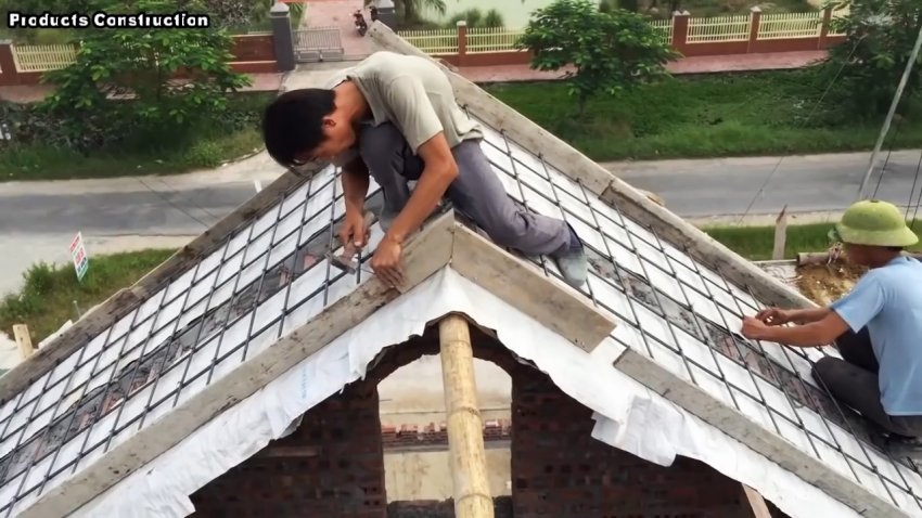 На обрешетку кровли, рассчитанную на запланированную нагрузку, укладываем полипропиленовую ткань или рубероид, закрепляя к обрешетке с помощью степлера или мелких гвоздей с широкой шляпкой. Поверх пленки или рубероида монтируем арматурный каркас. В первую очередь укладываем продольные элементы вдоль ската, а сверху – поперечные и соединяем их во всех узлах вязальной проволокой.