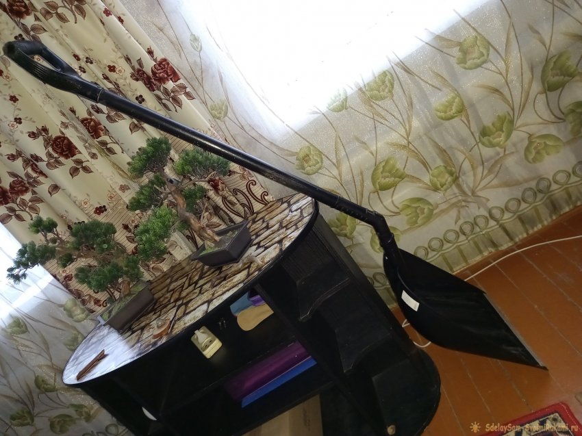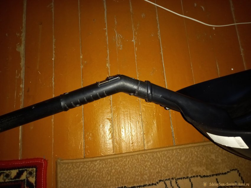Решил, что лучше пустить в дело его, нежели покупать сантехнический. Такой отвод от пылесоса найдётся не у каждого, потому и предлагаю купить идентичный по наклону и диаметру, сантехнический. Итак, отступаем от того места, где черенок стыкуется с лопатой на 6-7 см, и отпиливаем ножовкой. Вставляем оба отрезанных конца в полу-отвод, и фиксируем на два-три десятимиллиметровых самореза с каждой стороны. Вот что получится: